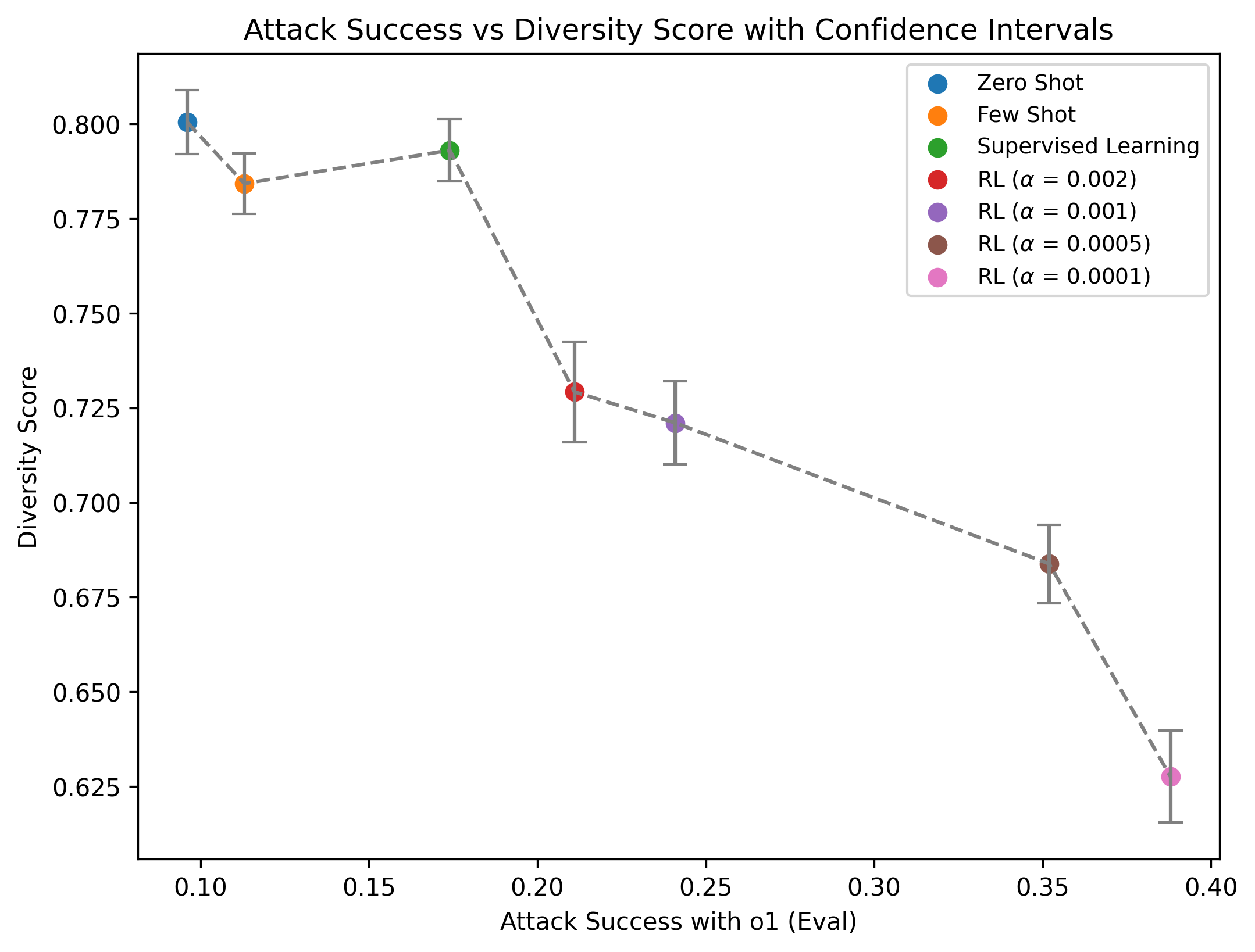 Automated red teaming methods struggle with generating high-quality and diverse attacks. In our earlier blog post, we used fine-tuned models to generate legal questions. We observed a tradeoff between attack success rate and diversity of attacks—naturally, if the model is optimized for attack success probability over all questions it generates, it would simply repeat the best attack it has found.