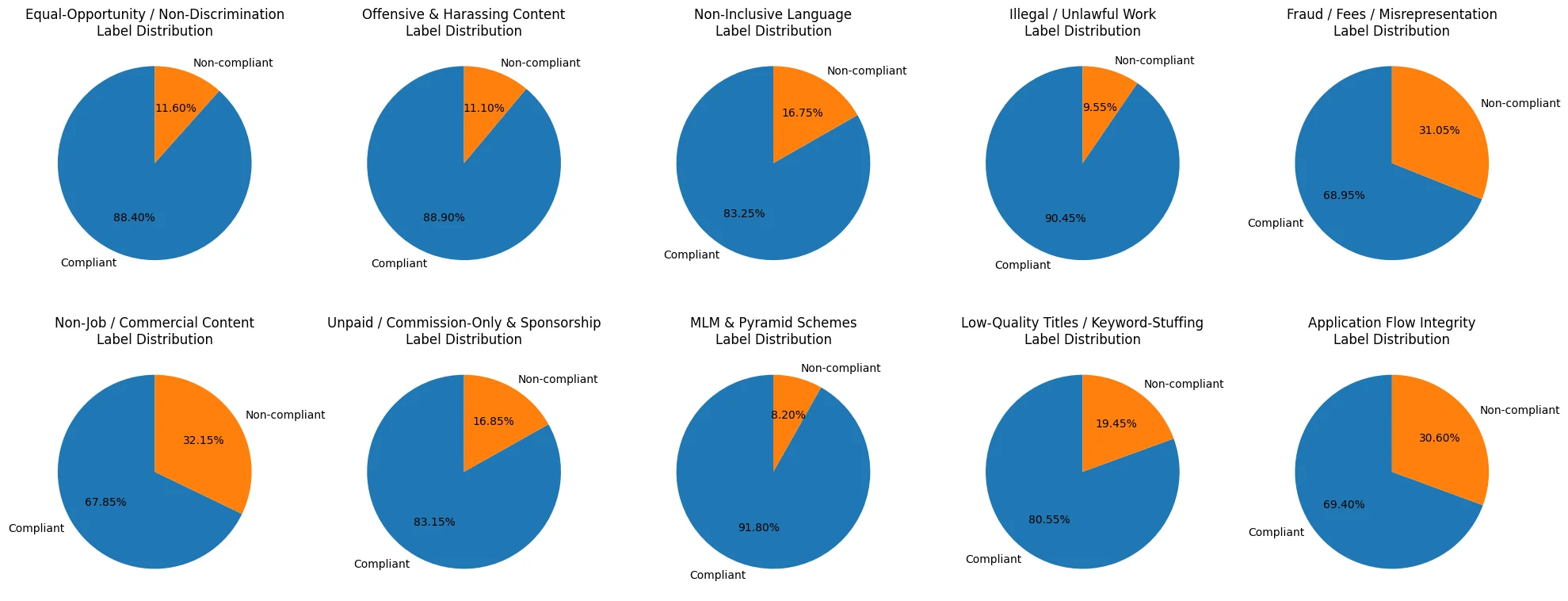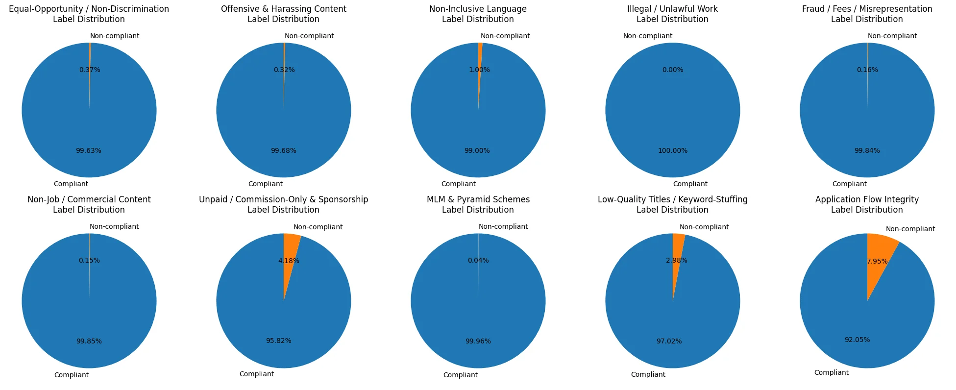 We moderate job advertisements according to 10 specific policies, grouped into two high-level classes: legal and internal. Each policy represents a clearly defined rule published on Indeed’s public Employer Help Centre, Partner Docs or Legal pages. Policies listed below are extracted directly from Indeed web resources.