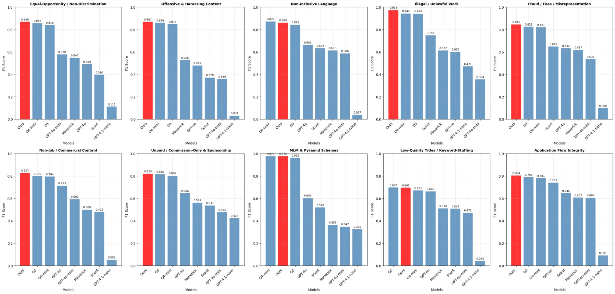 Our policy moderation models achieve human performance for job postings at <1% of today’s per-review cost of human moderation. Each policy employs a dedicated, compact model. Our model (F1 0.840) outperforms GPT-4o (F1 0.623), o4-mini (F1 0.837), and o3 (F1 0.835) while also operating faster and costing approximately 87% less.