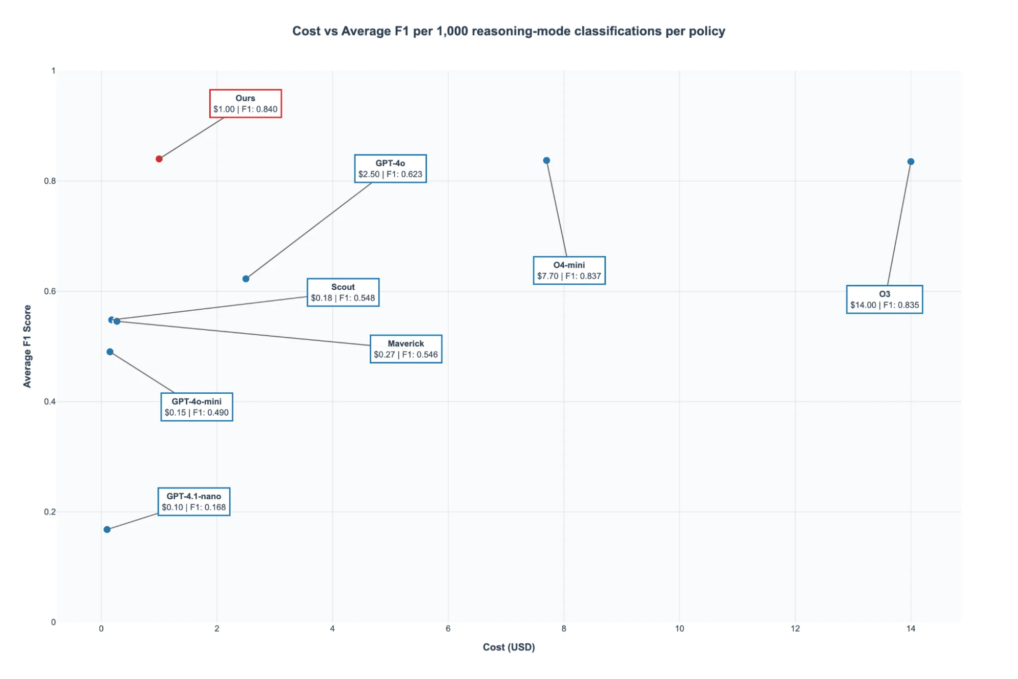 Figure 5 summarizes the trade-off between cost and performance. While reasoning-based models deliver strong F1 scores, their inference costs are several times higher than non-reasoning alternatives. Our approach achieves competitive performance comparable to reasoning models but at significantly lower cost. This cost reduction comes from leveraging domain-specific fine-tuning on a smaller model, and our library of proprietary red-teaming algorithms.